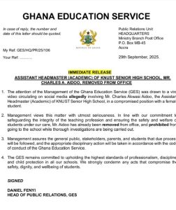THE GHANA EDUCATION SERVICE (GES) HAS REMOVED CHARLES AKWASI AIDOO ASSISTANT HEADMASTER ACADEMIC FOR KNUST SHS