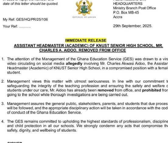 The Ghana Education Service (GES) has removed Charles Akwasi Aidoo, the Assistant Headmaster of KNUST Senior High School, from office due to a viral video showing him in a compromised position with a female student. The GES stated that they view this matter with utmost seriousness and are committed to safeguarding the integrity of the teaching profession and ensuring student safety.¹ ²